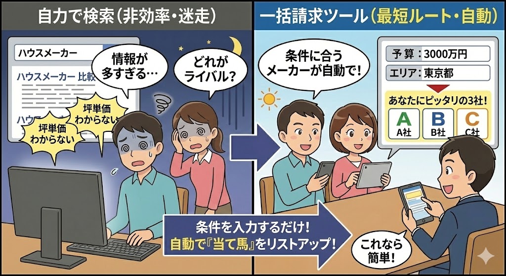 そこで提案したいのが、「展示場に行く前の、自宅での予習」です。まずは一括資料請求を使って、自宅にいながら「本命メーカーと戦わせるライバル候補」をピックアップするのが正解です。