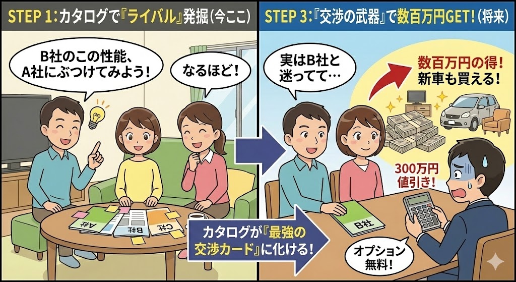 まずは無料でカタログを取り寄せて、「交渉の武器」を手に入れておきましょう。 その小さな行動が、将来の数百万円の得(=新車1台分や豪華な家具)に変わります。