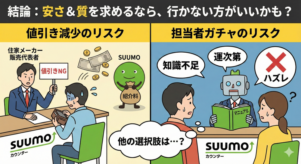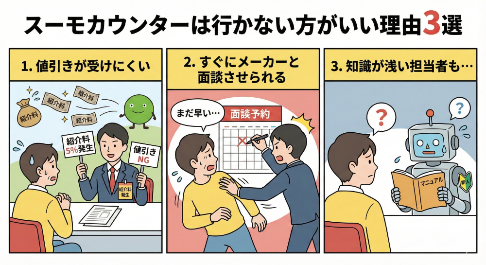 これが最も経済的なダメージが大きい理由です。 スーモカウンターは無料で利用できますが、その運営費はハウスメーカーからの紹介手数料で賄われています。