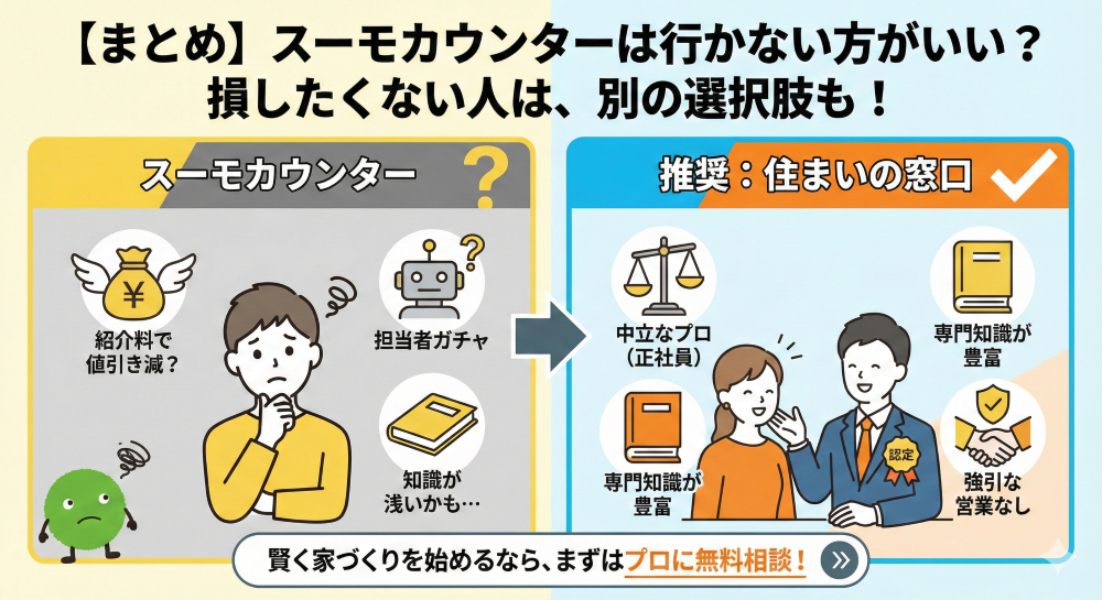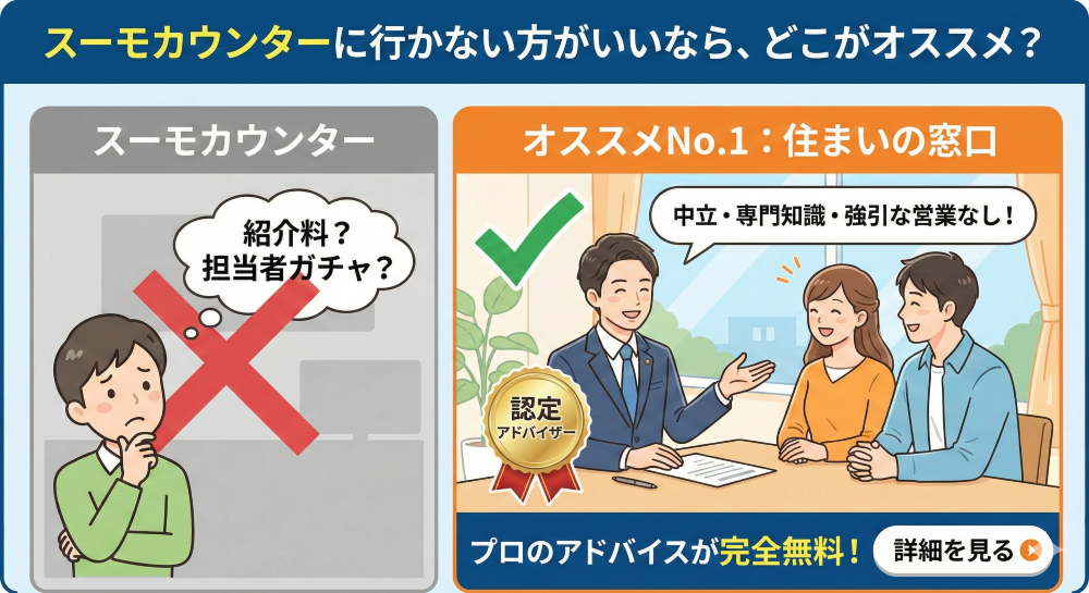 「家づくり、何から始めたらいいかわからない…とりあえずCMで見るスーモカウンターに行ってみようかな?」 「でも、ネットで検索すると『行かない方がいい』って出てくるし、何か裏があるの?」