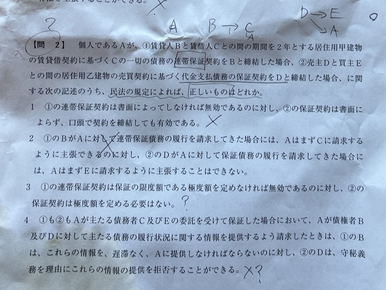 上記は権利関係のページのメモ書きです。 これは「自信を持って答えを選べた」からではありません。「あーでもない、こーでもない」と迷いに迷って、図を何度も書き直した痕跡です。